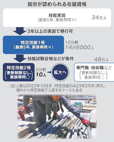対象拡大を検討しているのは特定技能「2号」。在留が最長5年の「1号」と違い、更新回数に上限がない。家族も帯同でき、将来は永住権も取得できる。これまで建設など2分野に限っていたが、飲食料品製造業のほか、産業機械などの製造業、農業など9分野の追加が検討される。