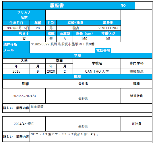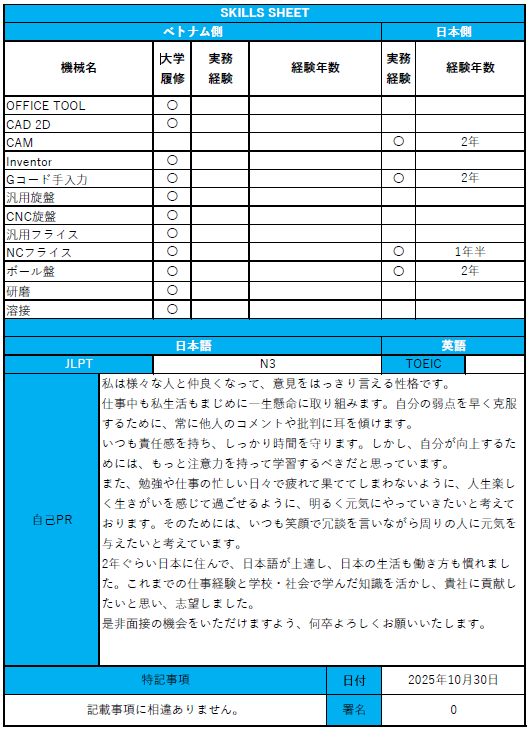 候補者情報(ベトナム 製造エンジニア)