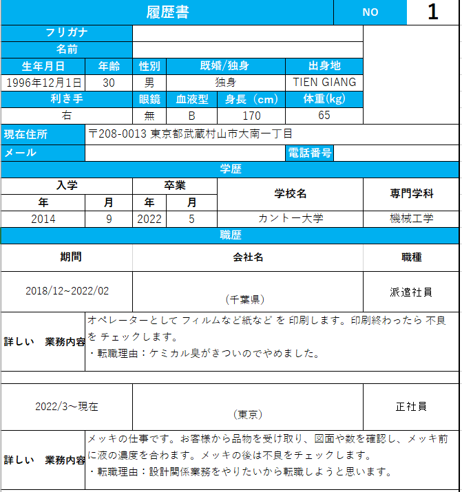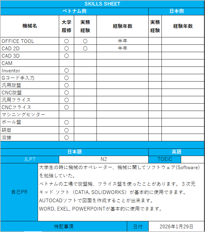 候補者情報(ベトナム 製造エンジニア)