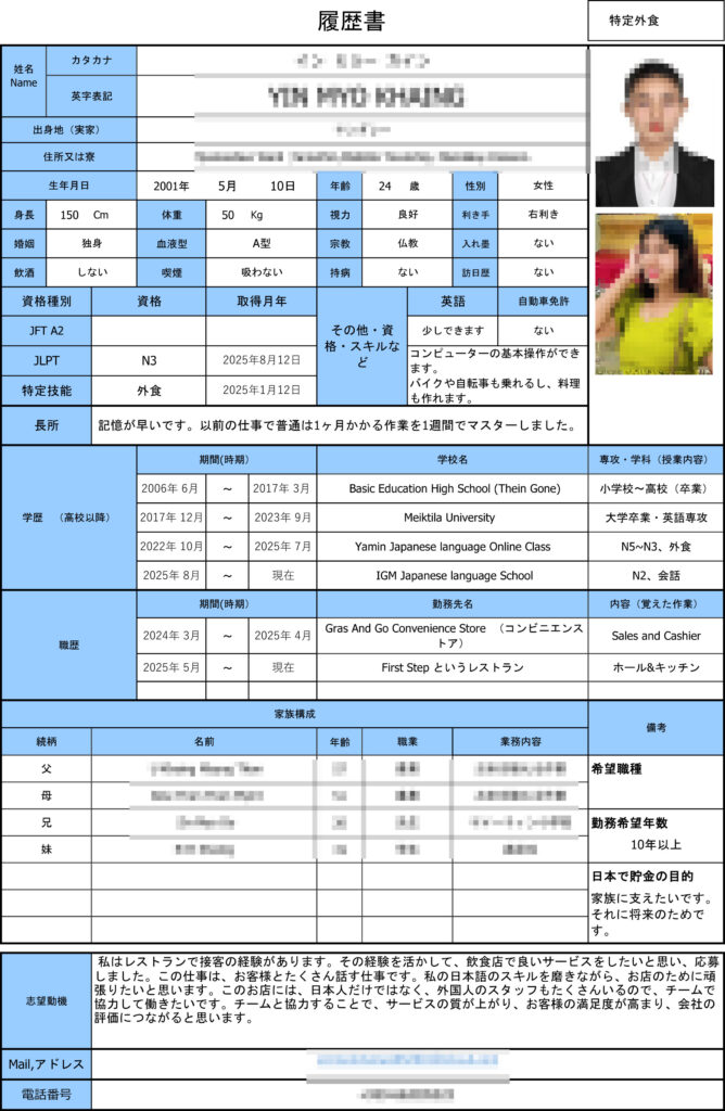 現在:ミャンマー在住。日本語N2です。レストランでホール&キッチンの経験があります。