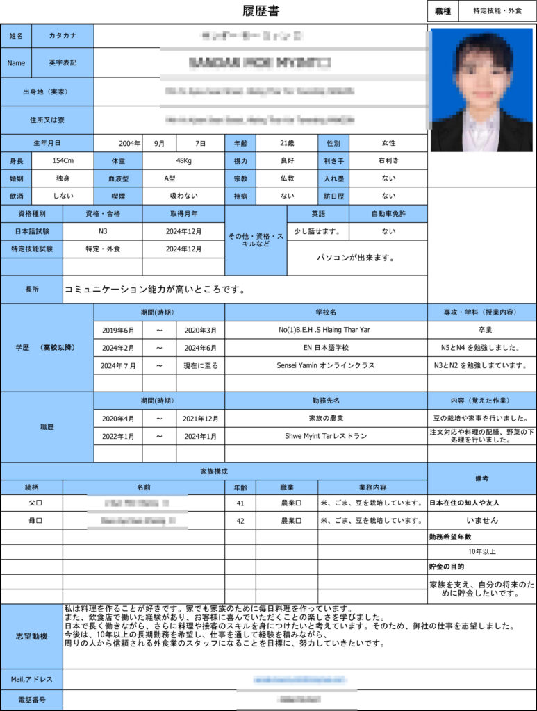 日本で長く働きながら、さらに料理や接客のスキルを身につけたいと考えています。そのため、御社の仕事を志望しました。