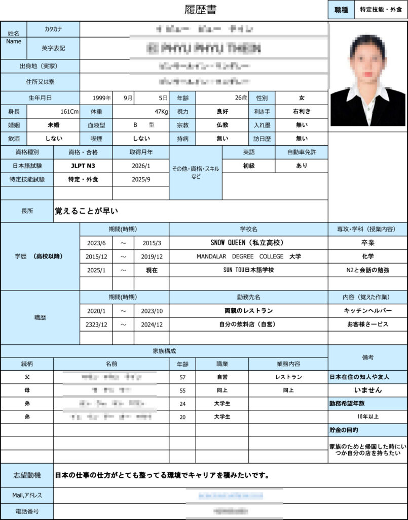 現在:ミャンマー在住。レストランで勤務経験があります。日本語検定N2を勉強中です。
