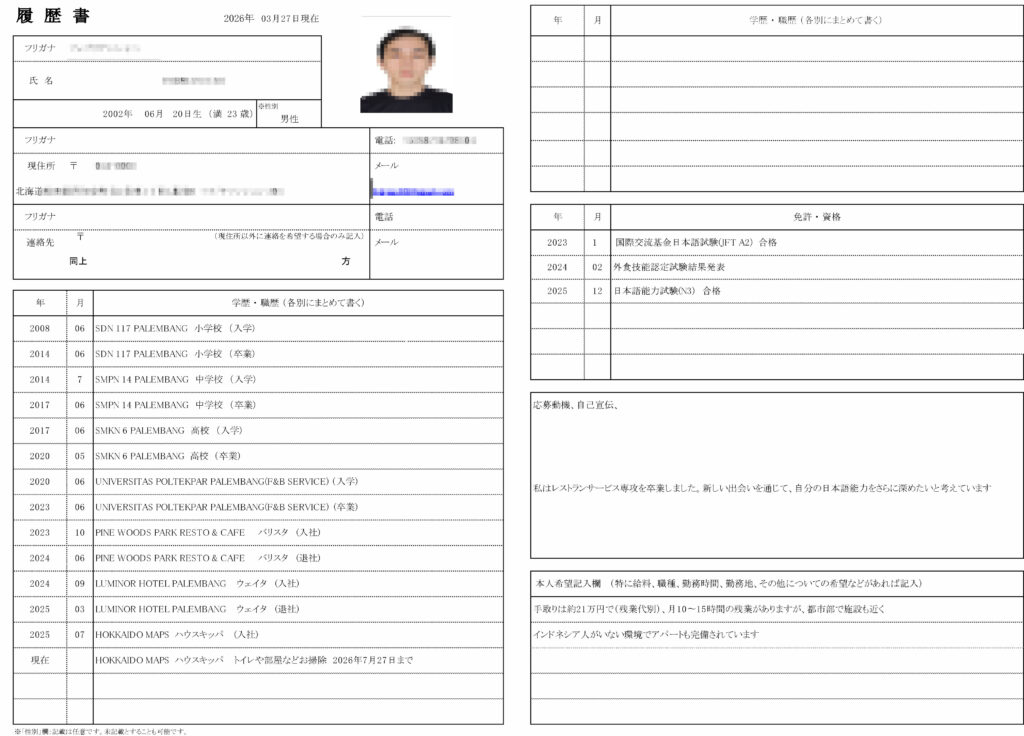現在:日本在住。母国のレストランで勤務の経験があります。