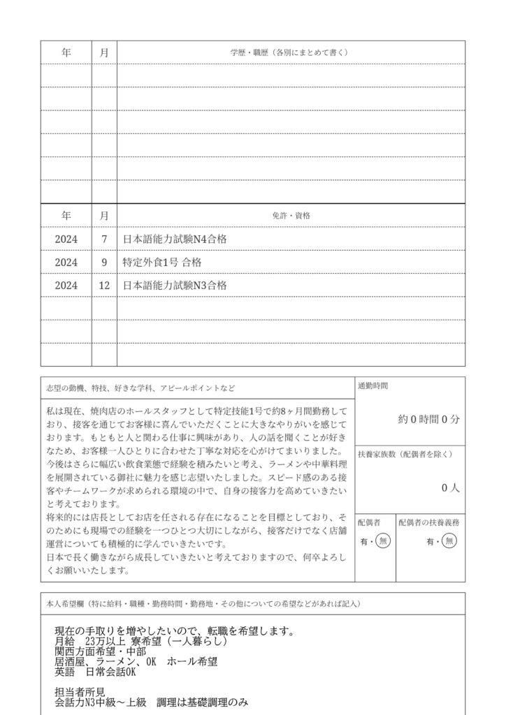 私は現在、焼肉店のホールスタッフとして特定技能1号で約8ヶ月間勤務しており、接客を通じてお客様に喜んでいただくことに大きなやりがいを感じております。もともと人と関わる仕事に興味があり、人の話を聞くことが好きなため、お客様一人ひとりに合わせた丁事な対応を心がけてまいりました。