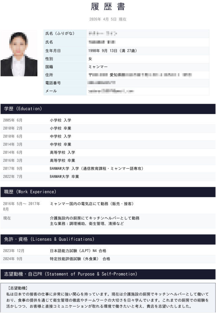 候補者情報(ミャンマー 外食人材)20260414-3